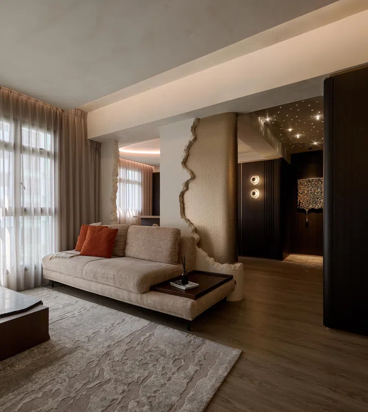 They chose to keep the colours quiet (think warm beiges, shadowy greys ) and let the materials do the talking. A Bearbrick figure with a cheeky Mona Lisa print adds a dose of personality by the couch.