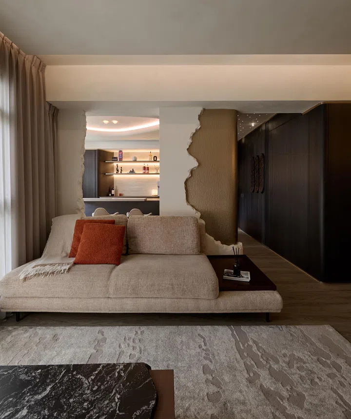 Rather than concealing it, they leaned in, carving out a jagged silhouette along the remaining wall. The rough-hewn cutaway gestures at something primal, though entirely intentional in its placement and form. This feature connects the living room and the space where the couple hosts guests.