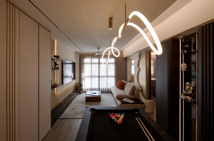 The 4-room HDB flat opens with a bit of theatre. A black pool table anchors the entryway, smaller than its usual size but cleverly proportioned to double as a dining table. Overhead, a sculptural VLUX light fixture spills across the ceiling like a molten ribbon.