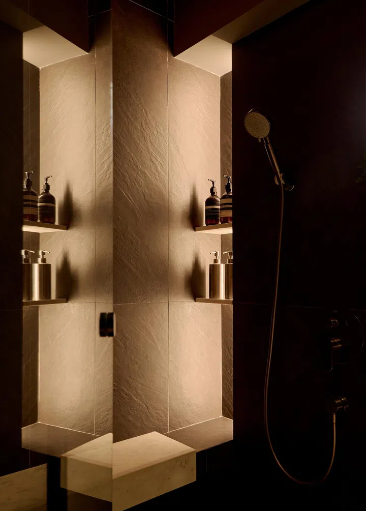 “It’s like a spa treatment room,” Adeline says. “The lights are minimal, so when you close your eyes, everything feels calm.” The bathroom’s artificial skylight adjusts in brightness, shifting across warm and cool tones depending on the time of day. “We both like long showers. This was important to us.”