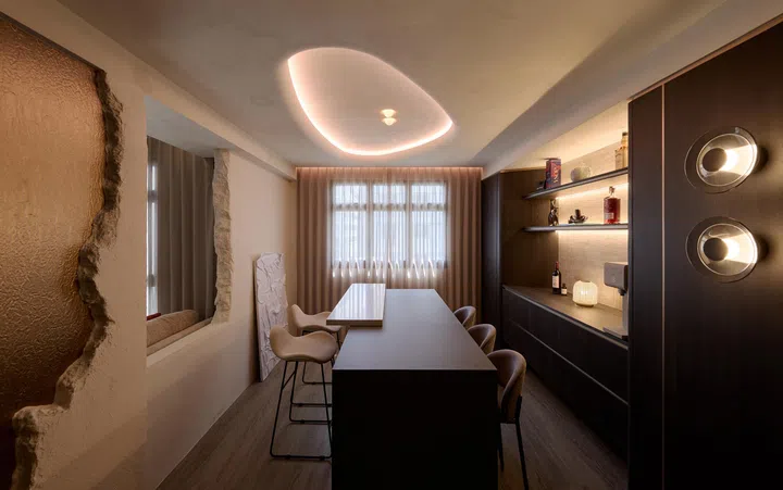 The husband describes this nook as a hybrid bar-meets-workspace, which is anchored by a dark, sculptural island. The island itself is layered: a matte dark stone slab forms the base, with a lighter travertine-like extension acting as a casual breakfast or cocktail perch. “We work here during the day,” he adds.