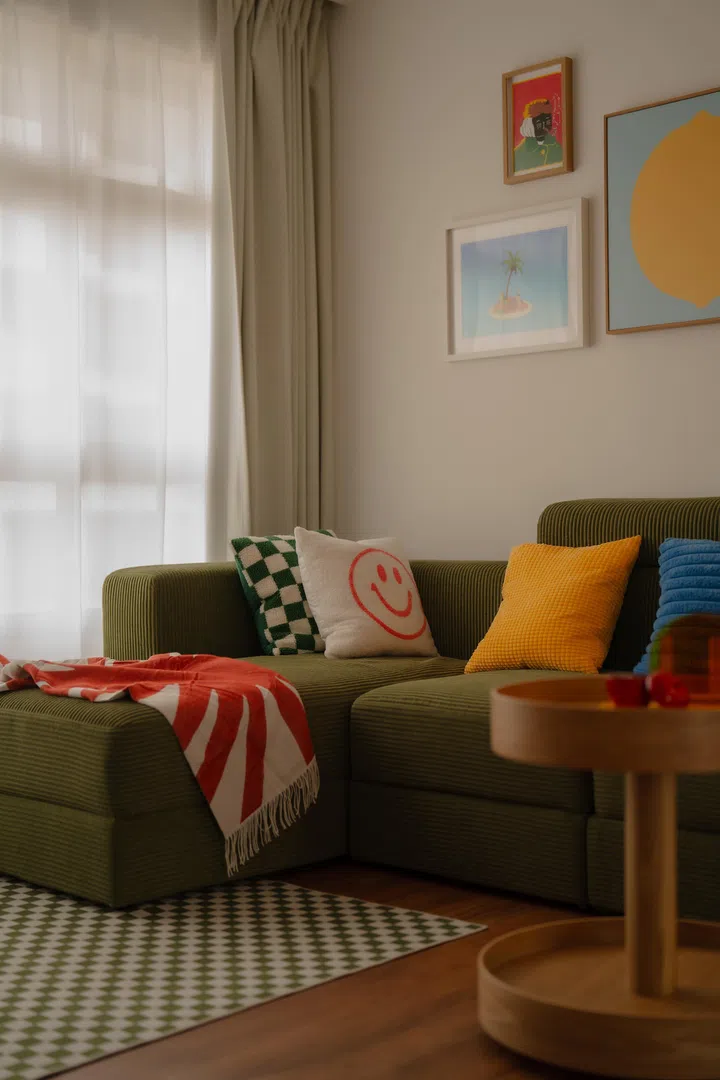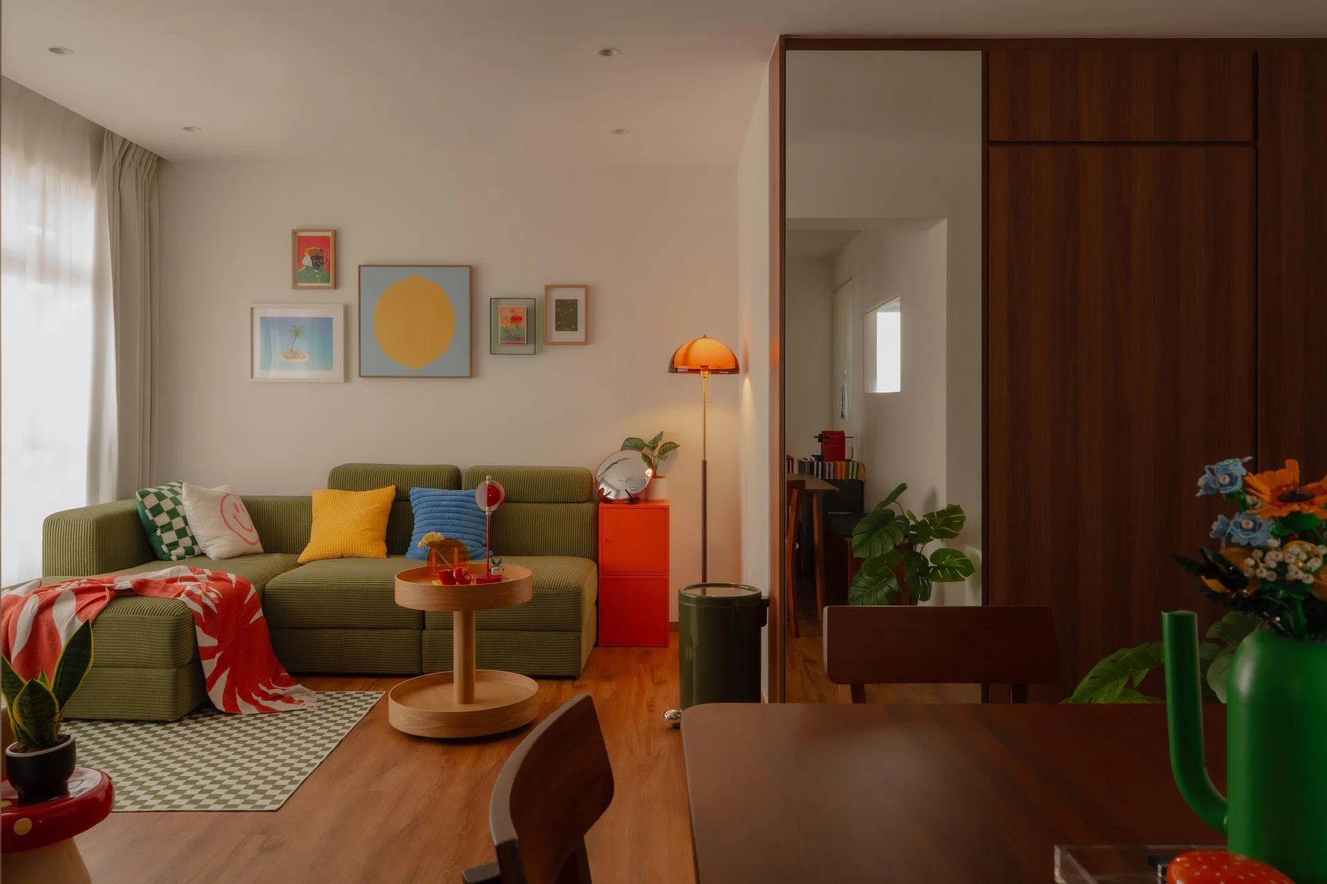 An olive green L-shaped sofa (from Ikea) is the focal point, and all of the decor and vibrant colour elements complement the couch. The checkered carpet works so well in this space. The orange standing lamp is from HipVan - you can always spot a HipVan design a mile away - and the industrial orange cabinet side table is from Ikea, along with the round double-level coffee table.