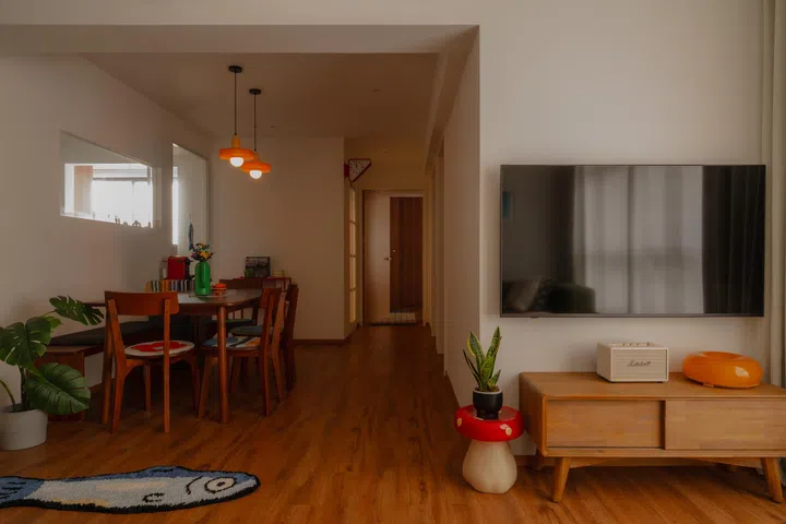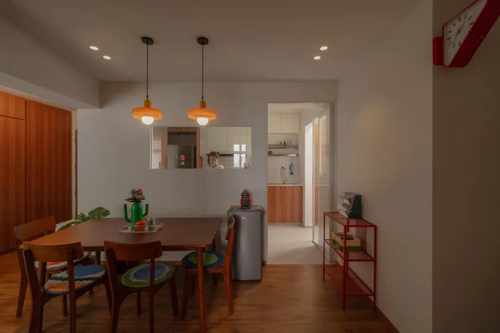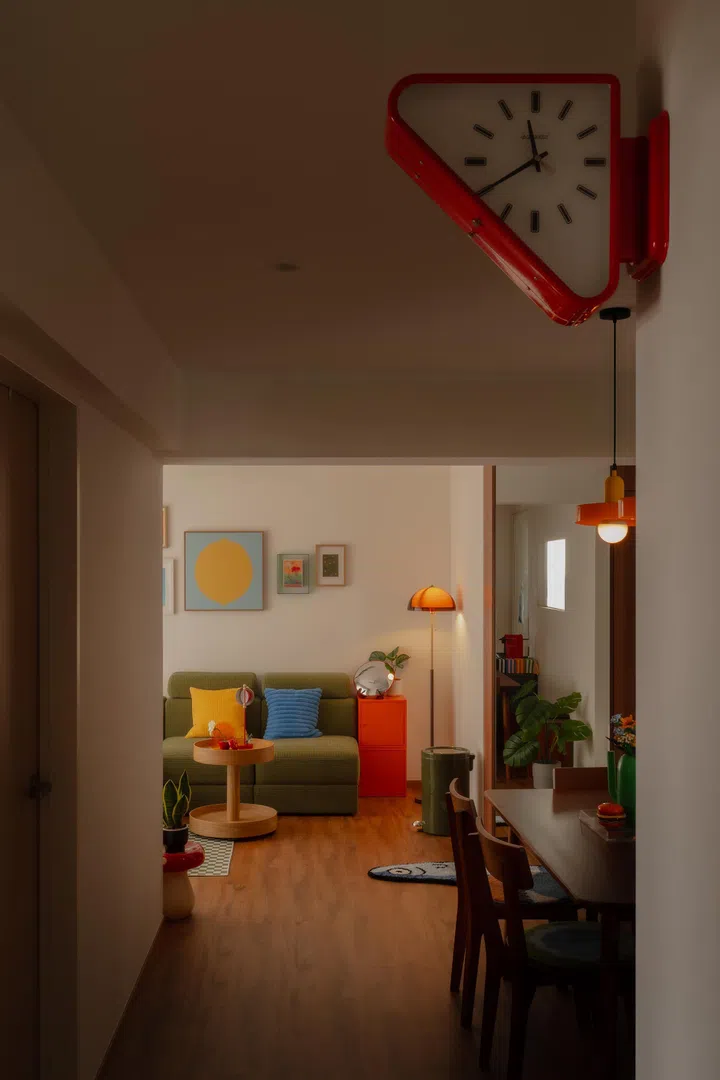 Cue the fish-shaped doormat, mushroom sidetable, tomato lampshade, fun scatter cushions, Lego flowers, illustrations collected from travels abroad, and interesting alternatives to the standard boring brown grouting works in this playful Mid-Century Modern-inspired 4-room HDB BTO.
