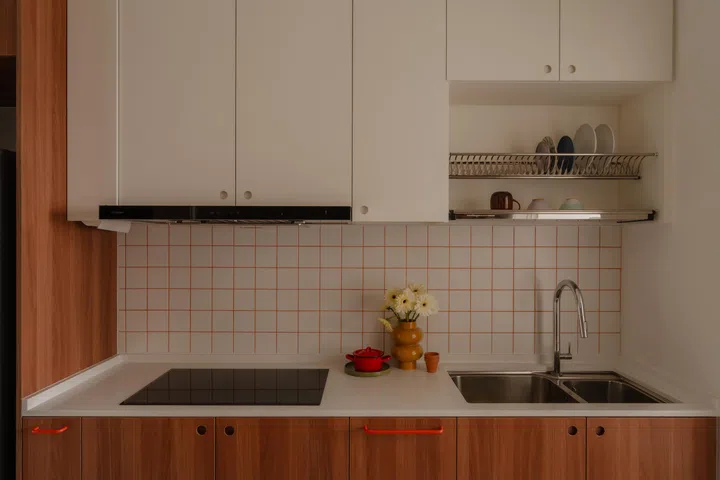 All of the cabinets (top and bottom) are a wood-effect laminate, in dark and light tones. The countertops are quartz. Forgoing the ordinary, they opted for red cabinet handles (purchased from Shopee).