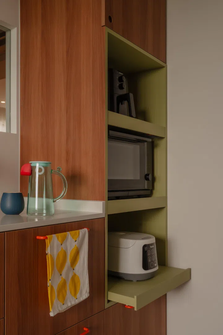 Opposite the built-in stove, they added a super cute, custom-built set of three pull-out drawers, done in a similar colour that matches the living room sofa. At one end of the kitchen is a separate utility area, home to their washing machine, etc.