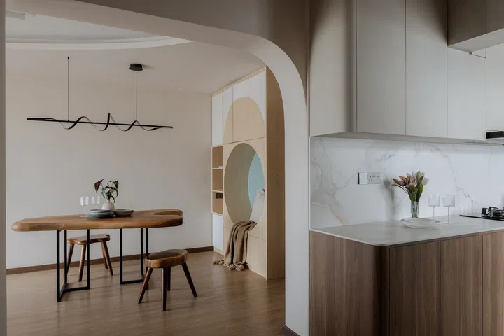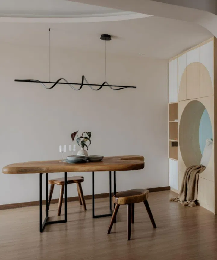 Flexibility and multi-functionality were two key design principles interior designer Jian Yu adhered to. “The spaces were designed to adapt to multiple scenarios—for example, the living room can also function as a classroom, and the study supports various activities—making the spaces more durable and responsive to changing lifestyles,” he shared.