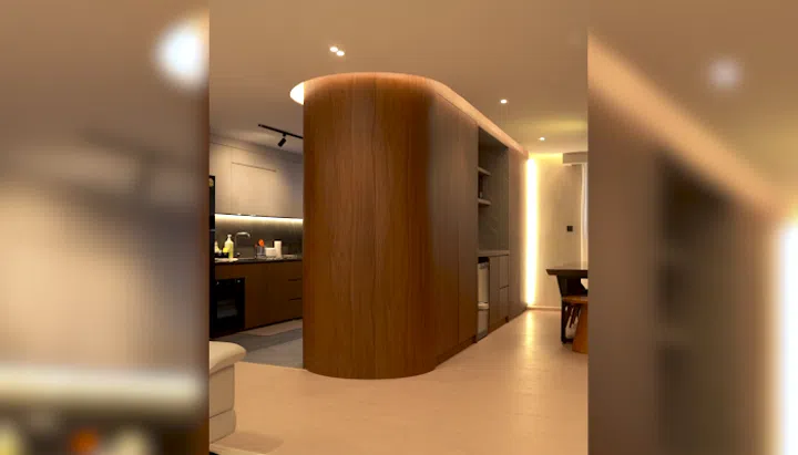 His bedroom, hidden behind a discreet door, is styled like a hotel suite. Fluted wall panels, ambient lighting and a quality mattress ensure restful sleep when he’s in town. The bathroom features a smart open-concept layout, with the sink moved outside to create more space inside the compact HDB shower room. “It feels like I’m showering in a five-star hotel,” he adds.