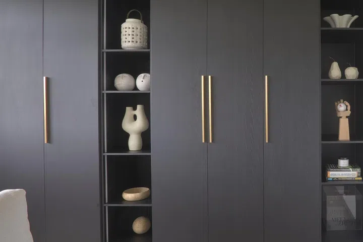 Two desks and chairs, as well as wall-mounted shelves at one end of the room address the couple’s work-from-home needs. At the opposite end of the room, full-height cabinets and shelves provide space for storage and display. This frees up the space in the centre of the room for a generously sized modular sofa where both the couple and their friends can relax.