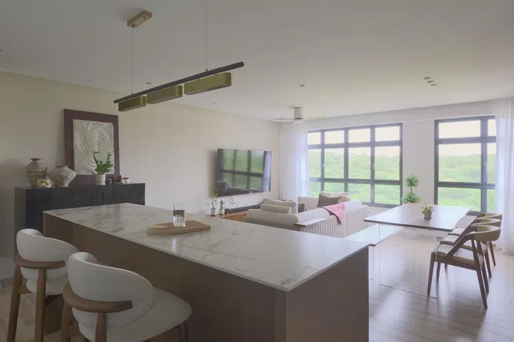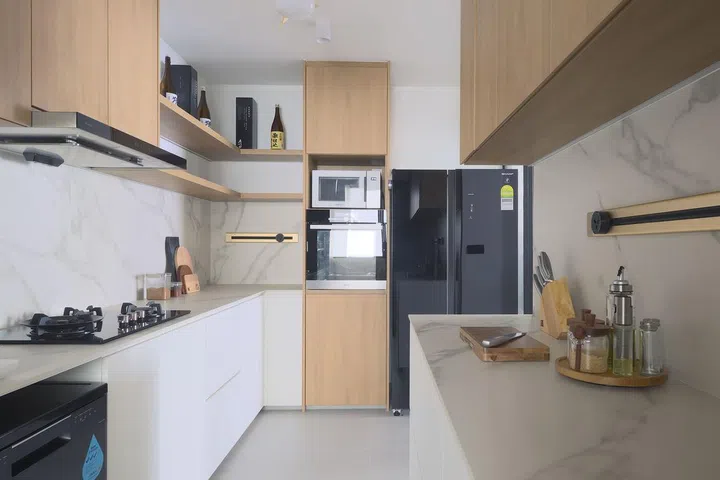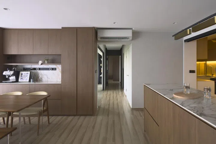 It also complements the pantry behind the dining room where the coffee machine is placed. Zhi Min comments: “The island is a really comfortable area for multiple people to gather around when they visit.”