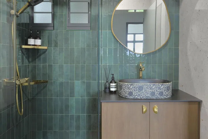 The bathrooms adopt a slightly bolder interior design approach. The master bathroom has a modern luxe look with the use of black marble-look tiles, while the green wall tiles juxtaposed against brass fittings and black-and-white Peranakan-style floor tiles give the common bathroom a cool, vintage-industrial vibe.