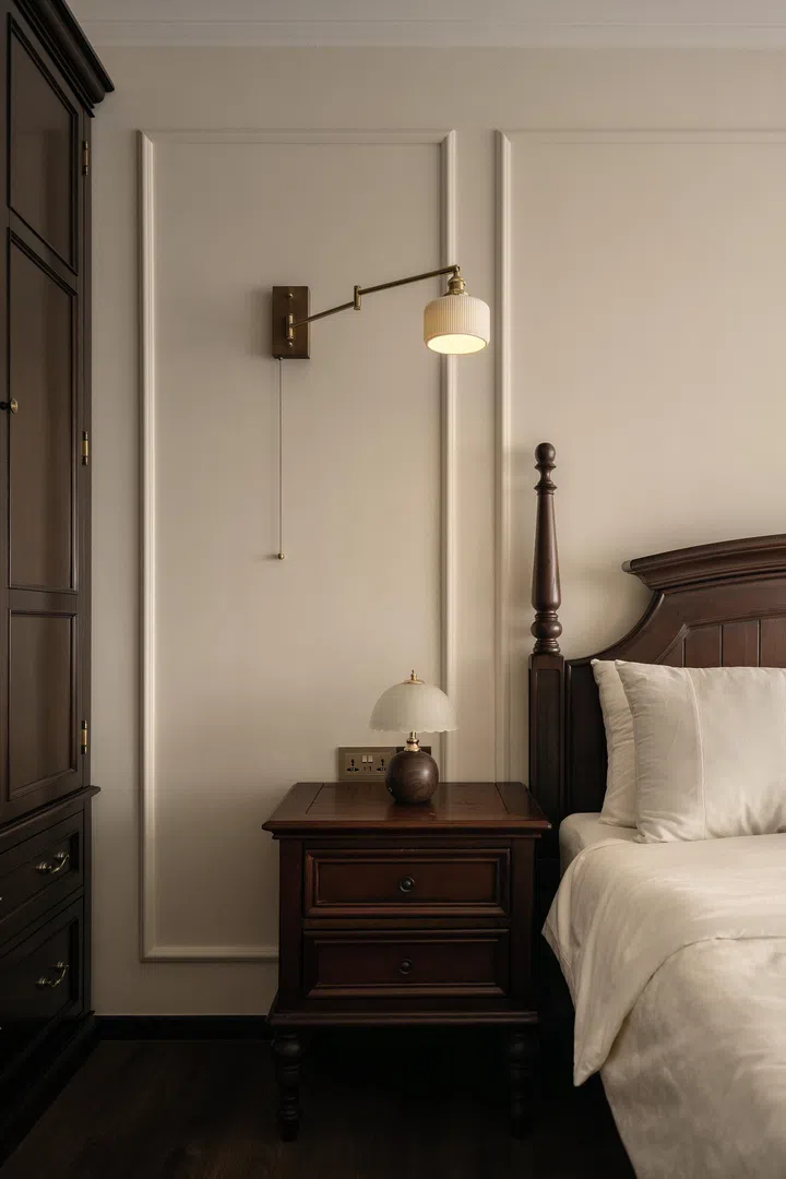 This room is kept simple yet elegant, exuding a masculine feel. It has built-in cupboards, a working desk and a chair. Navy-coloured wainscoting is implemented for the bottom half of the back wall, doubling as a headboard.