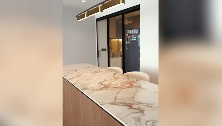 Zhimin, who gravitates toward aesthetics and storytelling, and Melvrick, who’s more pragmatic and systems-oriented, brought complementary energies to the renovation process. He focused on practical aspects like lighting and Wi-Fi placement, while she honed in on the textures, colours, and finishes that give the home its soul. The result is a home that feels both thoughtful and personal, including details like a textured corridor wall with brutalist overtones and a high-counter island designed for gathering and conversation.