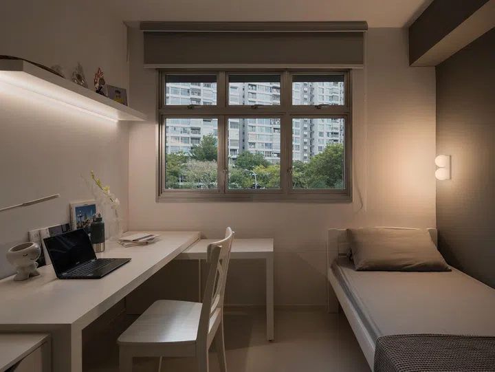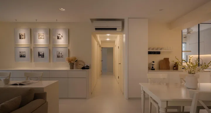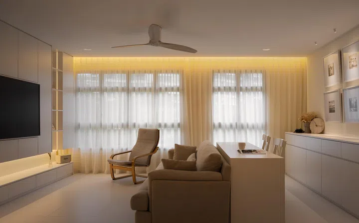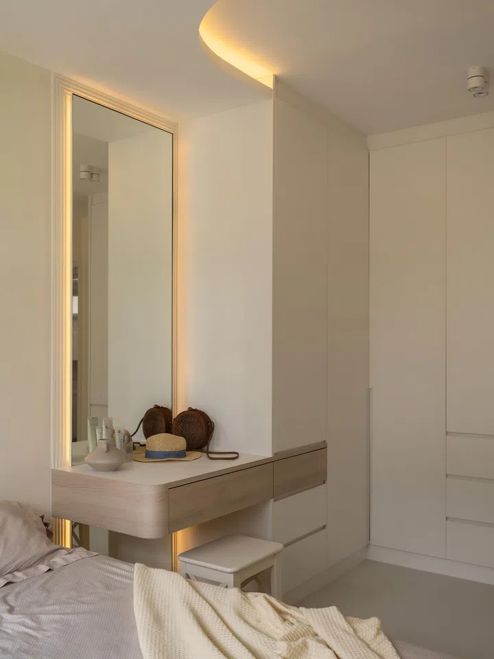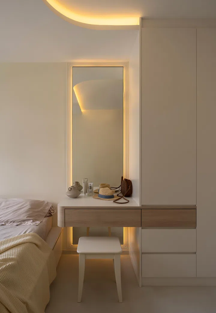 Keeping consistently to an all-white palette, the master bedroom ceiling features a curved cove lighting that instils a sense of warmth and softness.