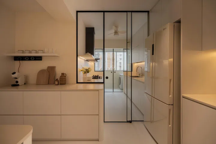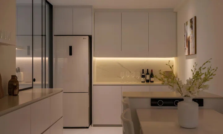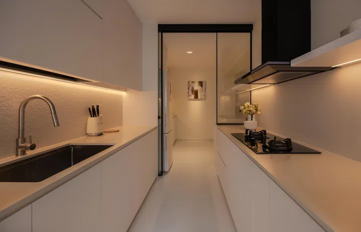 “I opted for full white top and bottom kitchen cabinets with white Silestone counter tops paired with white textured backsplash tiles,” interior designer Kah Fei points out.