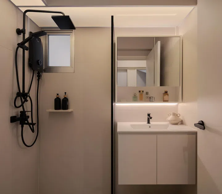 Interior designer Kah Fei introduced some black elements in the master bathroom such as the door handle, shower fixtures and the frame around the glass shower partition to complement the white colour scheme.