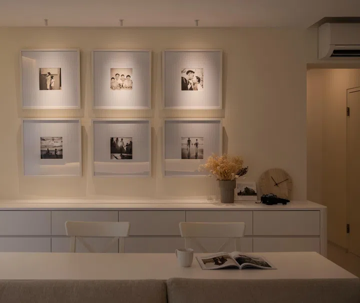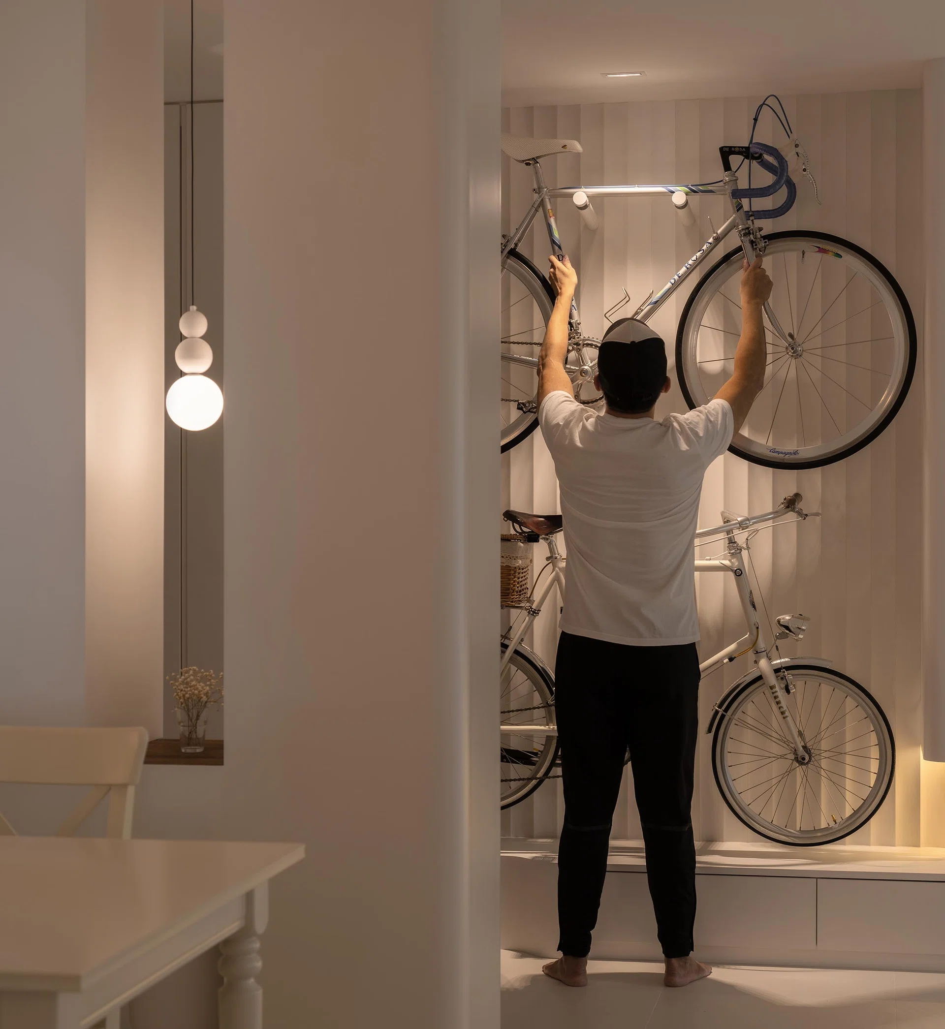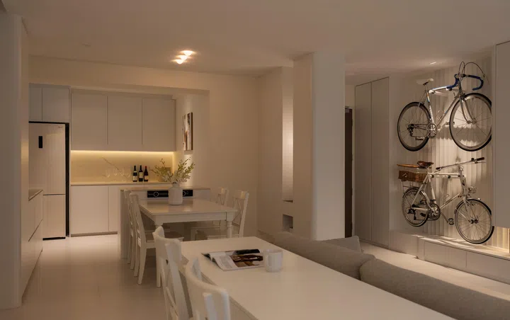 On the other side of the main entrance is a space where the couple can hang their bicycles. Propped against a white, fluted panel backdrop and illuminated by a downlight, the bicycles take on an art installation-like quality, which is perhaps why homeowner Wyman picks this as his favourite element within the apartment. Having this bicycle storage near the main entrance makes practical sense as there is no need to carry or wheel the bicycles across the house.