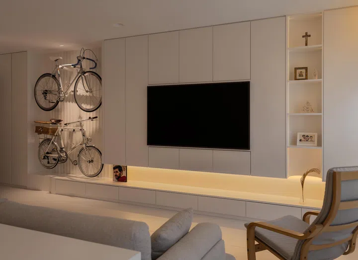 The television console begins below the bicycle wall and extends all the way across the other end of the living room. Right next to the bicycles is a suspended television feature wall that incorporates more storage cabinets and open shelves, all cladded in white. The storage does not just end there.