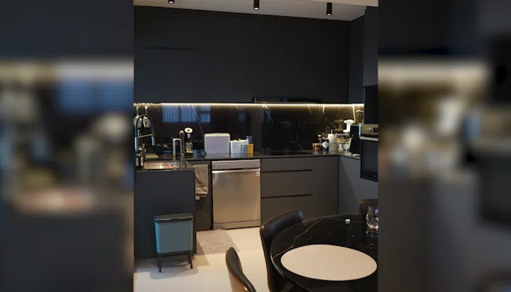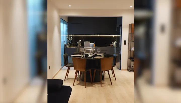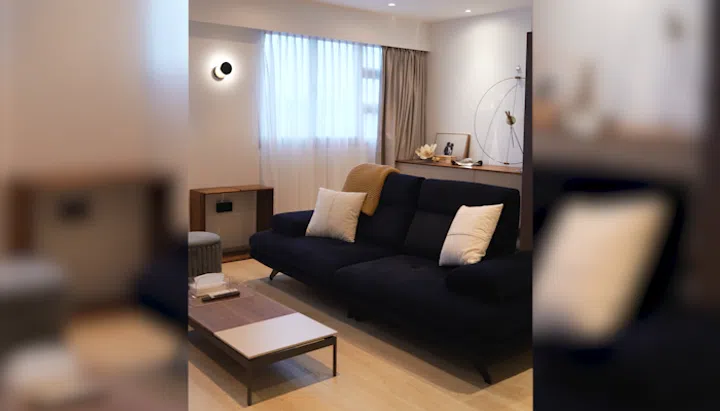 Once keys were collected, the real transformation began. With clarity and intent, they reimagined the entire layout of their 4-room, 1,000-square-foot flat. Out went most of the walls. In came an open-plan living space, filled with light, warmth and thoughtful contrasts. The original living room became a study, while two bedrooms were combined to create a generous, welcoming lounge.