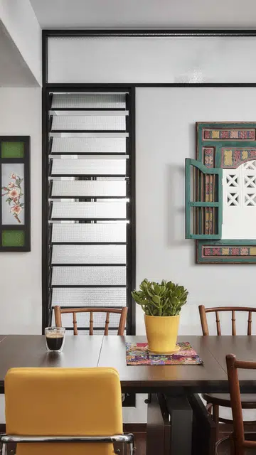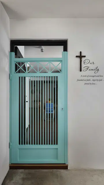 The customised gate is a standout feature reminiscent of traditional shophouse wooden gates. Made of mild steel and powder-coated in Tiffany blue, it blends with the Peranakan style inside the home.