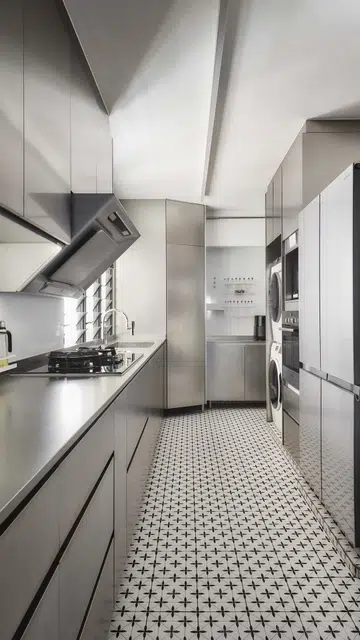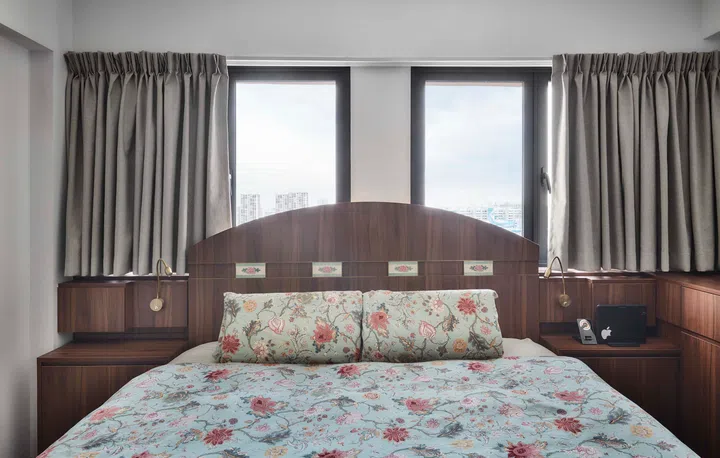 Formerly a home with three bedrooms and a study, it now has six bedrooms. These include a room for the helper and a guest room that doubles up as a playroom. This transformation came about from overhauling the existing layout. The interior design team changed the L-shaped kitchen into a rectangular one and reconfigured the dimensions of the bedrooms and study.