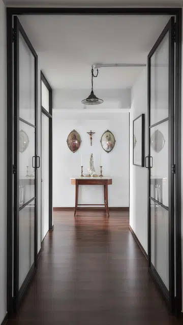 One bedroom eats into the balcony space, now level with the living area. Along this side of the home, the design team created a long corridor with desks by the windows. These desks sit outside the newly configured bedrooms, which can be closed off with doors and louvred windows.