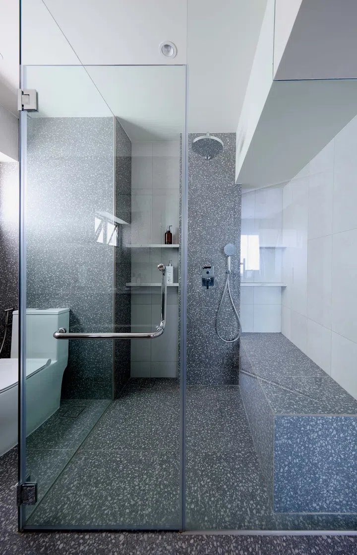 The attached master bathroom is spacious and modern with its combination of off-white marble and grey terrazzo tiles. A hotel-style shower seat checks all the boxes for aesthetics, functionality and elder-friendliness.