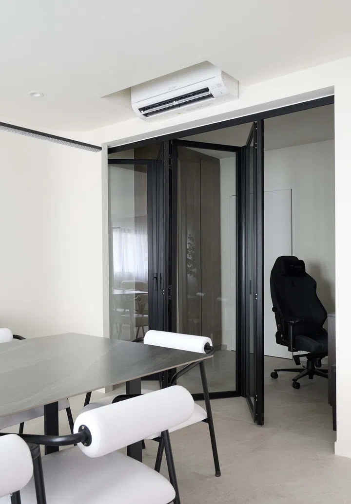 The home office faces the dining area, which was originally a balcony in the HDB plan. Slide-and-fold glass doors offer the flexibility of enclosing the home office when Joey is at work, or opening the two spaces when desired. The use of glass also allows natural light from the dining room window to filter into the home office.