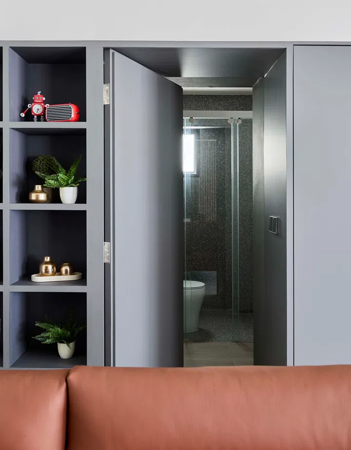 Access to the common bathroom used to be from the kitchen. Relocating the bathroom entrance to the living room, concealed within built-in cabinets and shelves, helps maximise the efficiency of the kitchen space and layout.