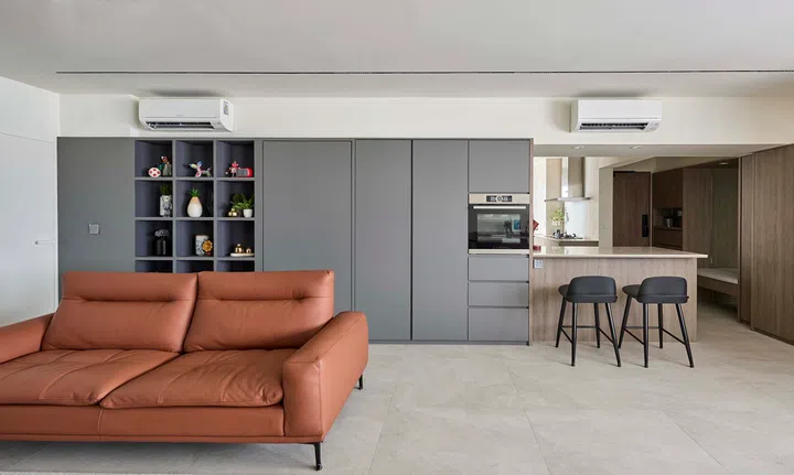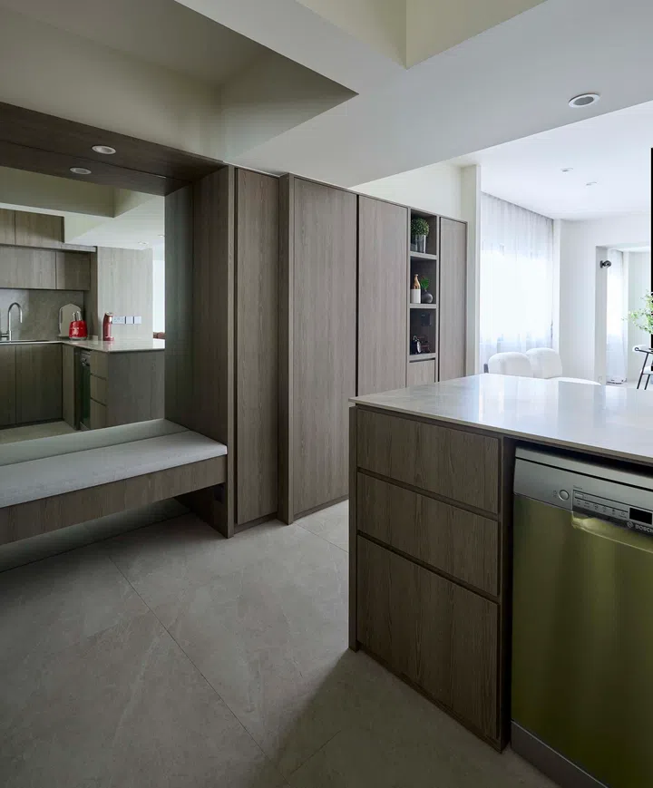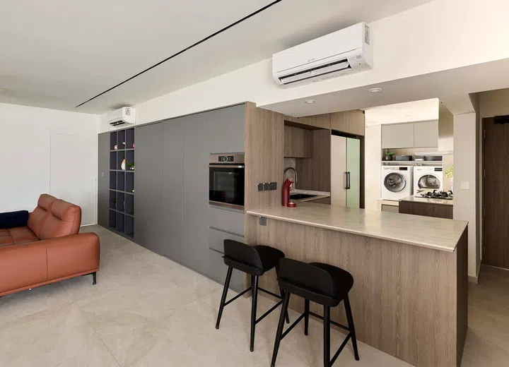 Respecting the couple’s preference for open-concept dry and wet kitchens, Jin Hai had the kitchen wall demolished. In its place, he introduced a kitchen island with a sintered top that provides additional counter and storage space. As the couple often hosts family and friends, the island seamlessly integrates meal preparation and socialising.