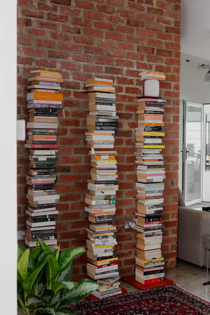 Against this are three rows of red standing book stacks from Xtra, each piled high with books. In front is a delicious redish maroon Persian rug. This entire section adds a yummy pop of colour across the screeded floors.