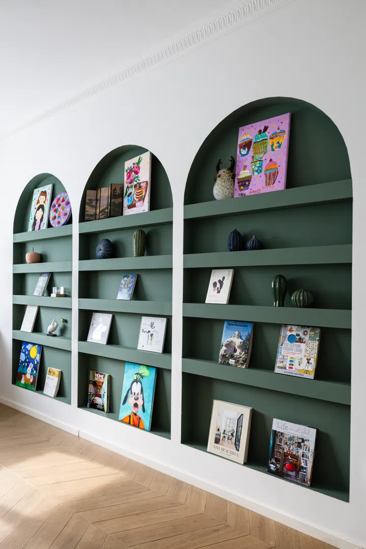 Her seven-year old daughter is into art, so it was important to have a dedicated area for her to display her work. Jenny created three arched shelves specially for this, with additional room for her bedtime story books.