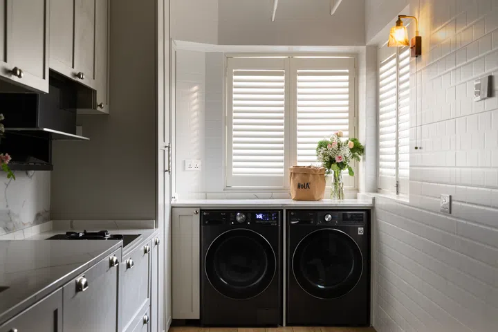 As her helper is very petite, she designed the kitchen counter at different heights to make them more ergonomic for her. The laundry area is located at one end of the six-metre long kitchen with a separate washer and dryer.