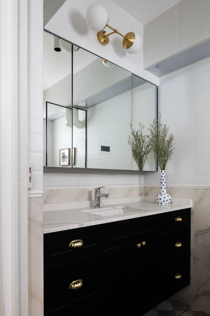 A black vanity cabinet adds depth and calmness to the space, paired with gold hardware that adds a touch of luxury.