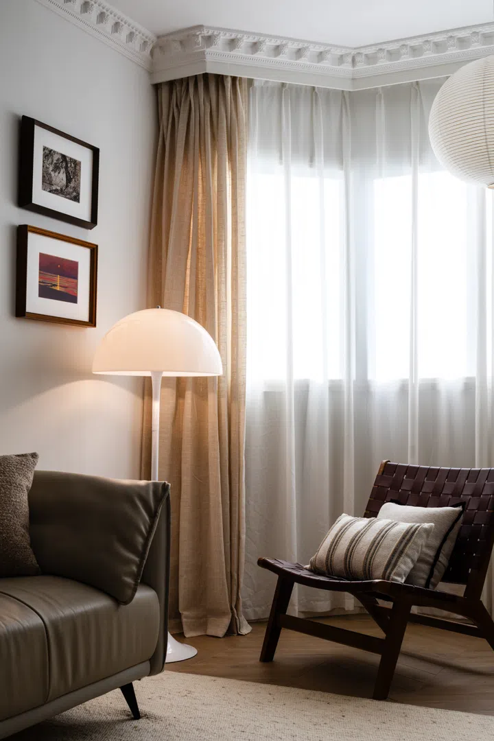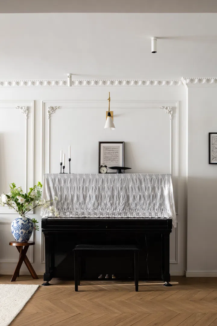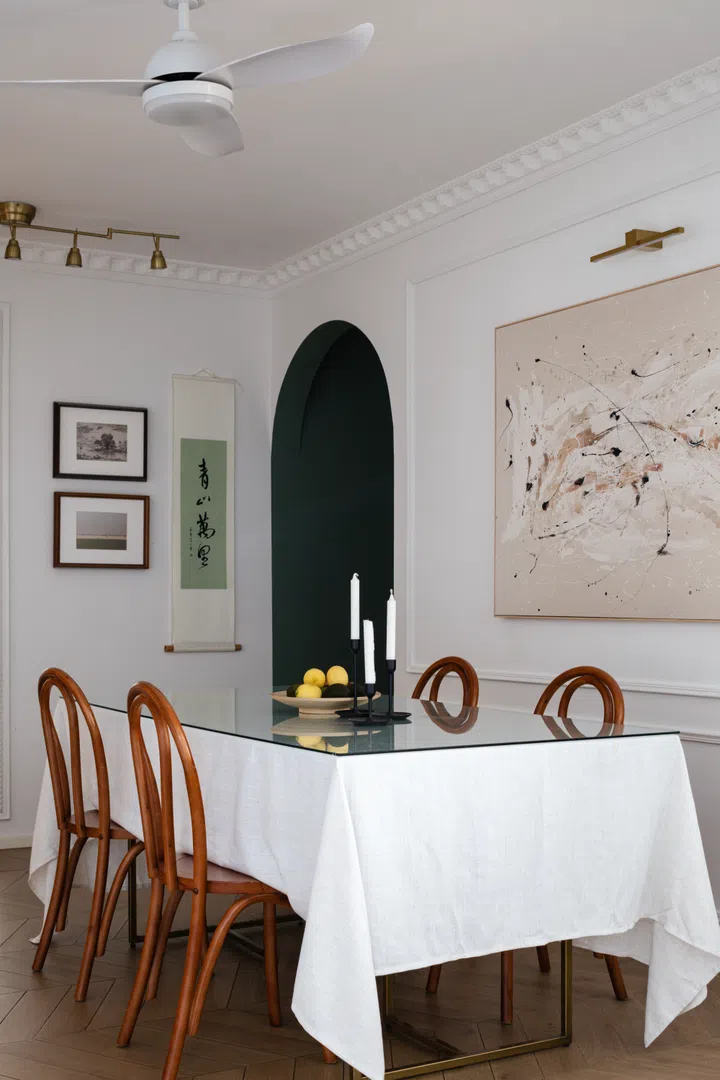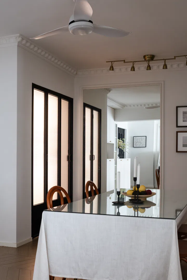 The existing glass sliding doors to the balcony were removed and the floor levelled to make it part of an expanded living room space. Plaster moldings and beading details on the white walls inject a touch of French vintage charm.