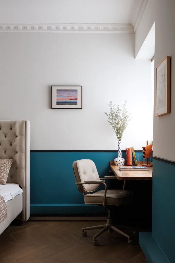 In her youngest son’s room, she introduced a half height cabinet with wheels in one corner, which can be converted into a desk when he is older. In all the bedrooms, only the lower half of the walls are painted to maintain a balanced look without overwhelming the rooms.