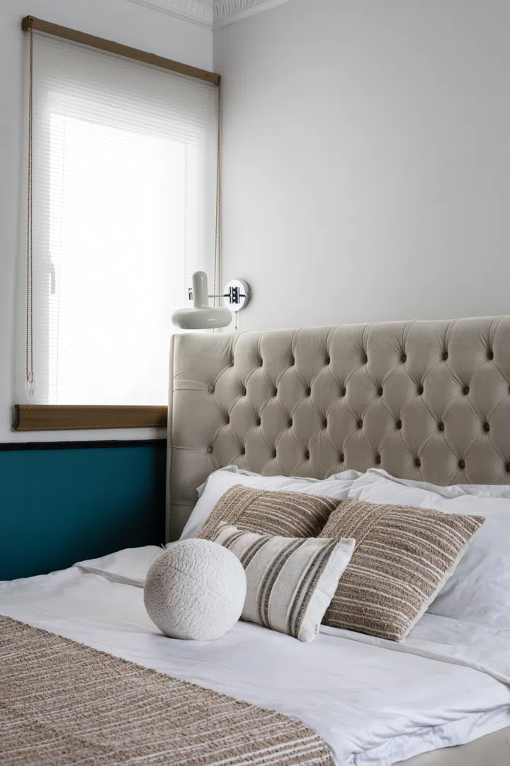 The bottom half of the wall has been painted a turquoise blue that reminds Jenny of the Aegean Sea. She selected the painting partly for its soft pink and blue tones, as well as because she can imagine herself standing in front of the sea gazing out at the misty, dreamy coastline.