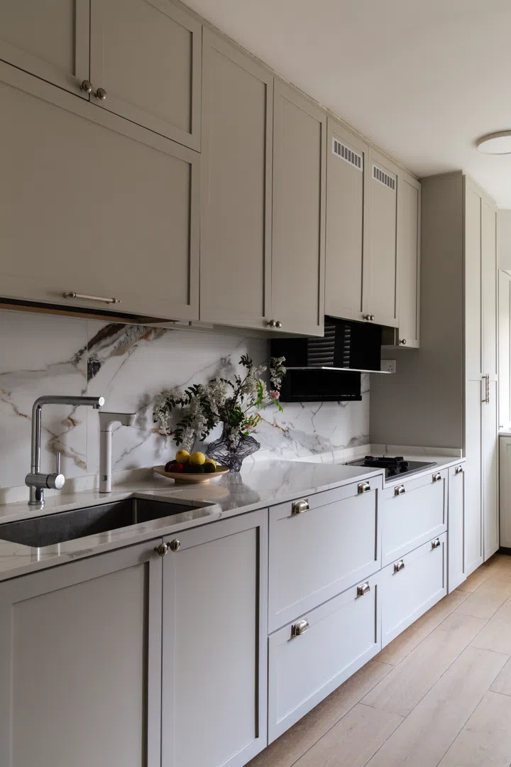 As with most HDB kitchens, there were many exposed pipes and ducts. Her solution was to conceal them using built-in cabinets, which also address their need for storage.