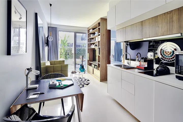Designed by Project File, a polished grey paette and chic accessories give this three-bedroom condo maisonette (pictured above) a showroom-flair. A cool grey was chosen for the backdrop while a mixture of dark and light wood laminates used throughout complements the look.