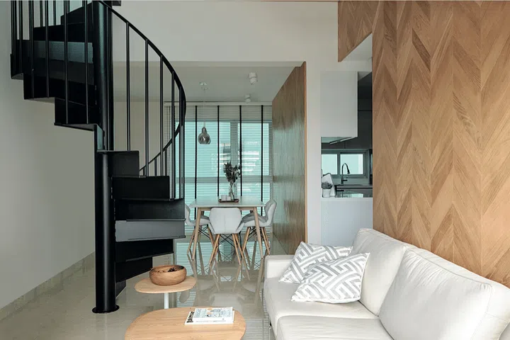 Not many homeowners have the luxury of a double-volume space in their flat, so Goh Rong Yi and her husband, wanted to take full advantage of this feature in their three-bedroom condo unit at Eight Riversuites (pictured above), and further accentuate it, too. Their designer, Keave Lim of Eightytwo, created a visual statement in the home through the addition of a spiral staircase, which is used to connect the lower floor with the newly created loft level. This style of staircase also helps to save space.