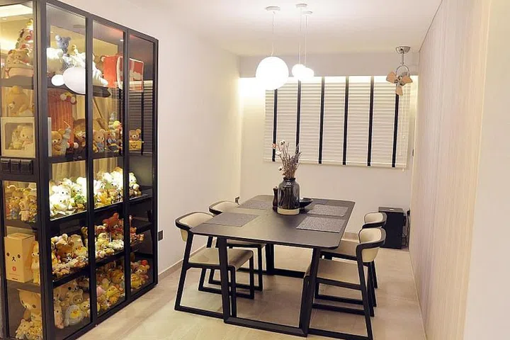 A tinted glass cabinet with black leather laminates showcases the rest of Mrs Lim's bear collection and acts as a divider between the living and dining areas. Mrs Lim calls it her "bear condo" and her favourite part of the home.
