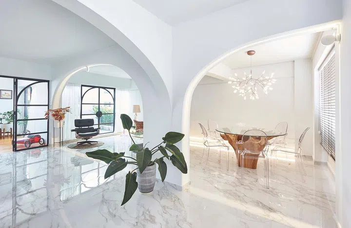 The first floor is light, bright, and peaceful – thanks to a major reconfiguration. Most of the internal walls were removed, save for a structural column. The natural light streams in from specially-fabricated arched doors that open out to a study and the terrace. Dess also put in gentle arches for an organic look. As a result, the central column resembles a stylised tree with branches spreading out – a happy coincidence that fits perfectly into the brief. “A lot of things evolved over time,” says the homeowner. “If there is a word to describe this flat, it’s organic.”