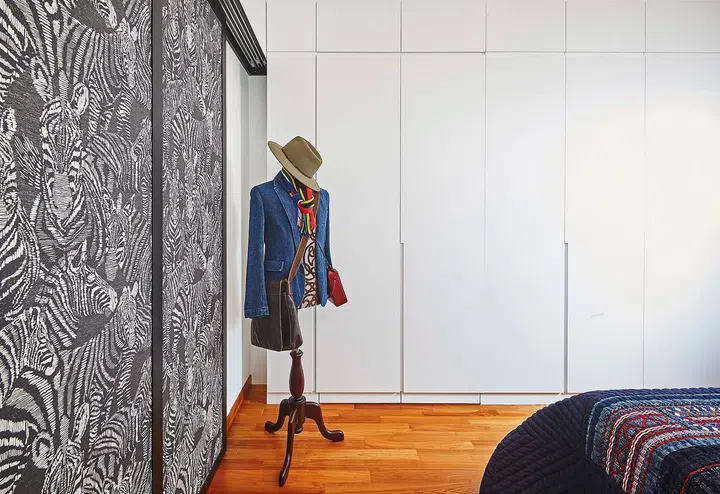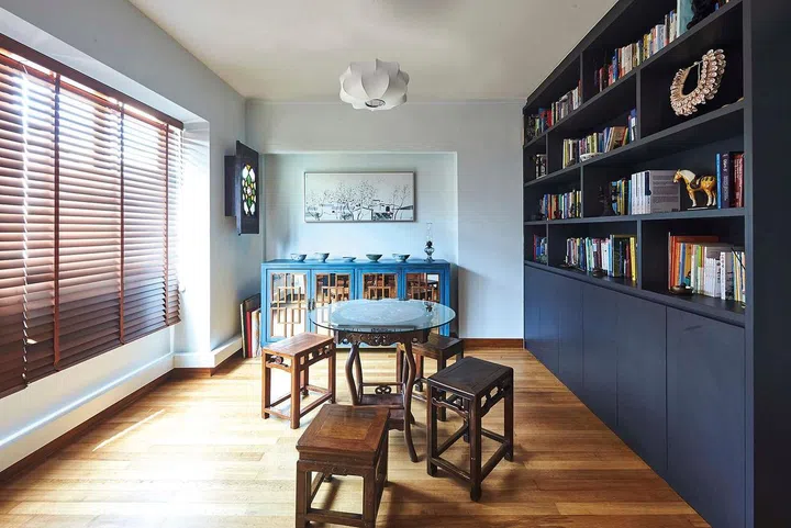 The second floor has a warmer, intimate feel with chinoiserie elements. Much of his furniture collection resides here, including full-height shelves that hold his books and smaller mementoes. A set of old stools sit next to a vintage cabinet and a piece by his favourite artist Wu Guan Zhong, while the sofa bed is shielded from view by an antique screen that belonged to a family in Northern China more than a hundred years ago.