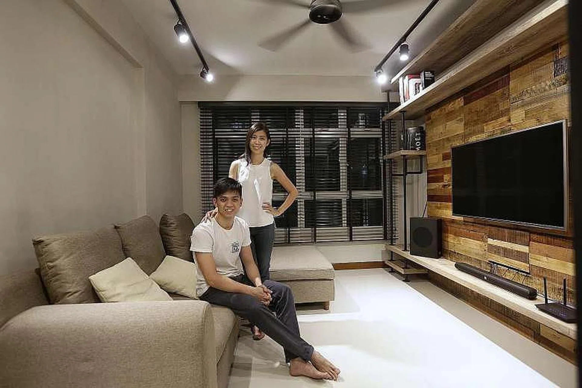 Their 990 sq ft HDB Build-To-Order flat features a television shelf in the living room made from recycled pallet wood and black piping.