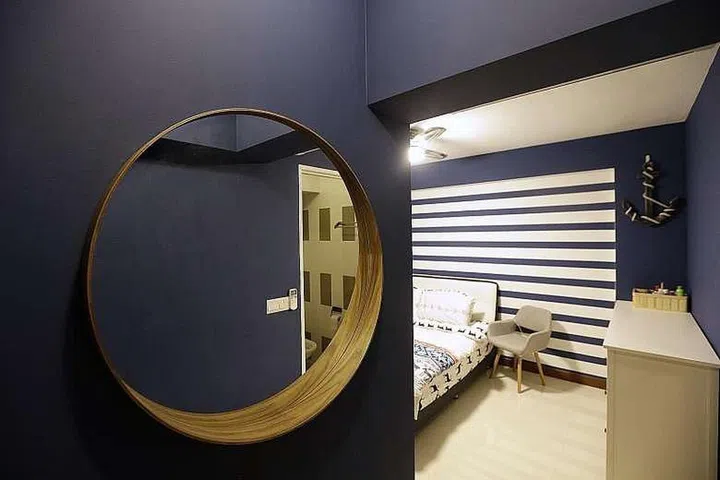 They have also done up the master bedroom in the nautical style, complete with a blue-and-white striped feature wall, a porthole-inspired mirror and a decorative ship anchor on the wall.