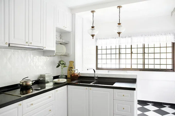 In the kitchen, the choice of white cabinetry and walls serves multiple purposes in this European-style HDB. Beyond creating the illusion of additional space, these light surfaces reflect natural light, brightening the entire area and contributing to the airy, elegant atmosphere characteristic of European style interior design. The result is a kitchen that feels both spacious and sophisticated, proving that size need not limit style.