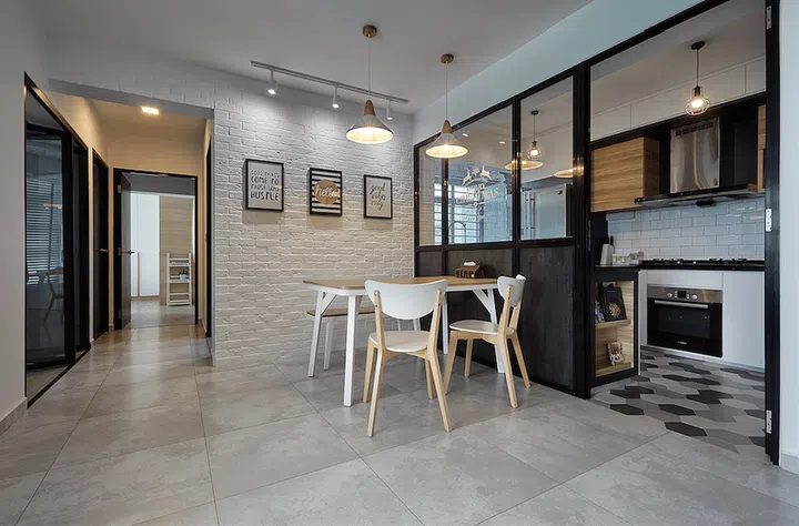 The wall between the kitchen and dining area was hacked and replaced with black framed glass windows, opening up the area for a sense of spaciousness.
