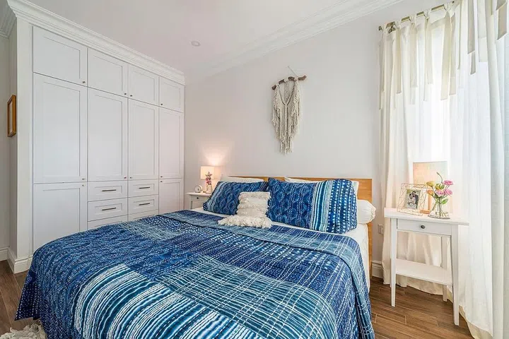 In the bedroom, the couple chose a patterned blue duvet cover. It certainly adds to the cosy farmhouse look!