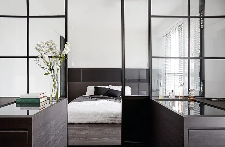 The vanity counters, in front of the sliding glass panels of the master bedroom, feature glass insets on the surface for a boutique-style display of accessories.