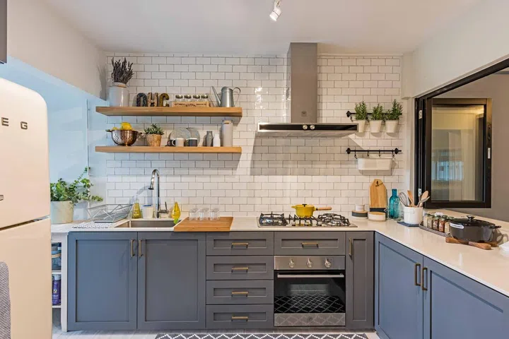 A grey-blue hue was her colour of choice for most parts of the home. This shade is used from the dining area, to the kitchen and bedroom too.