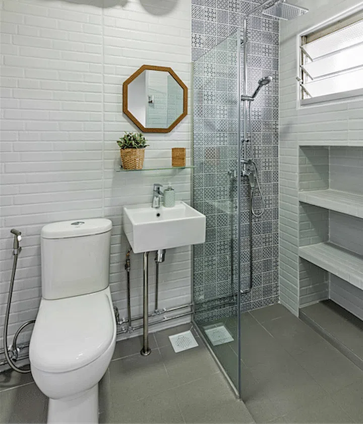 White and Peranakan-inspired subway tiles are used in the master bathroom.